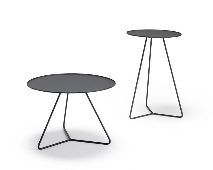 A series of delicate, round side tables made of metal for living and sleaping area. Designs in four colors painted. The table is available in two heights 45 and 60 cm.