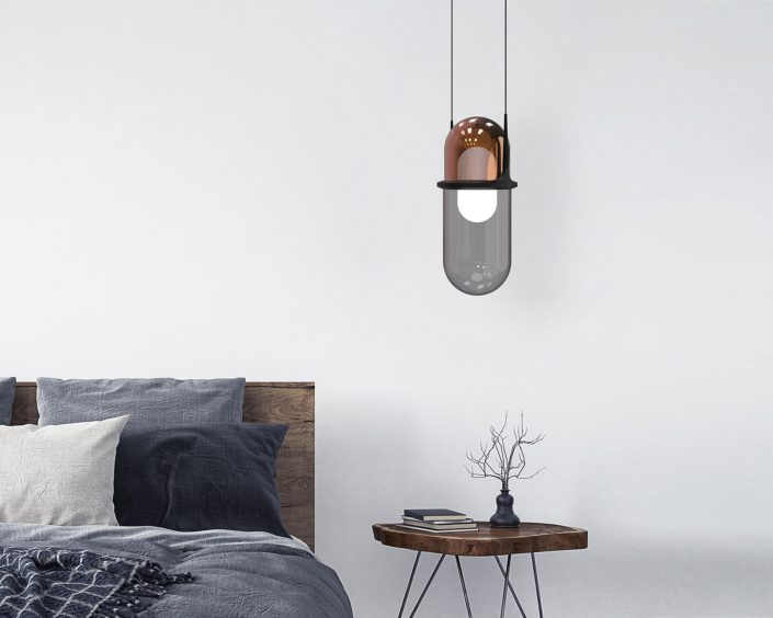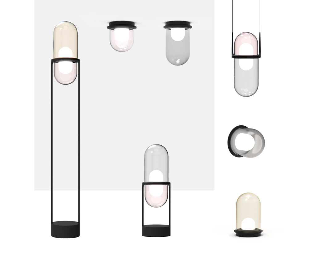 A glass pill, sculpturally floating, supported by two slim cables. Various glass colours and surfaces offer almost infinite combination possibilities.