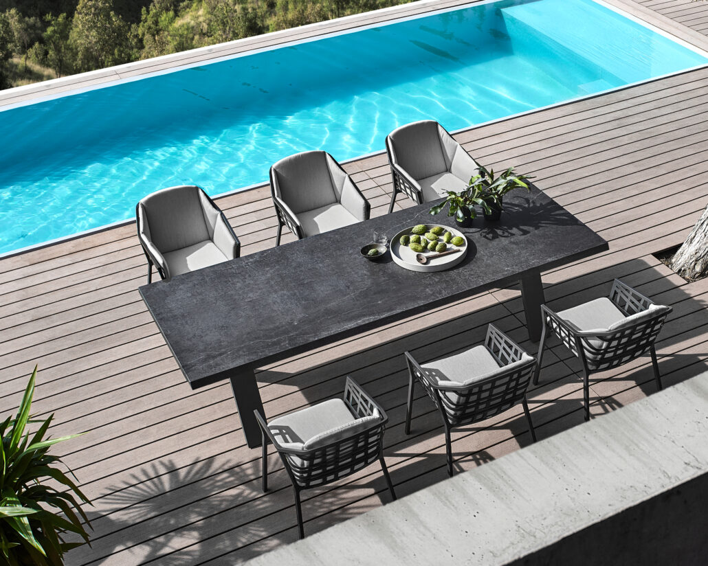Table with a top of mitred ceramic plates. The clean processing creates the impression of a massive 5 cm thick tabletop made of stone. The powder-coated aluminum base has been developed for the TIMBER table and here is a second application where it can prove that it can carry large loads extremely stiff and vibration-free.